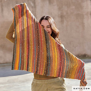 This garter stitch shawl pattern is perfect for knitting with 1 ball of Hiro Merino wool and artisanal silk yarn. Measuring 100 cm tall by 80 cm wide, this knitted accessory is multicolored and allows for multiple outfit combinations. The color stripes can vary in size and position, giving it a pinstripe-like appearance. Knit one in every color while you binge-watch your favorite show!