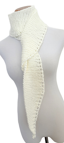 The matching scarf is knitted flat, growing and decreasing at the beginning and again at the end, showing a pretty eyelet detail along one side. The scarf measures 72” in length and 4.5” in width. Written pattern.