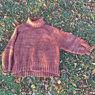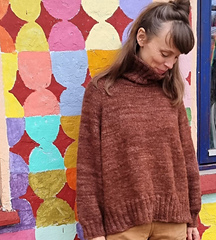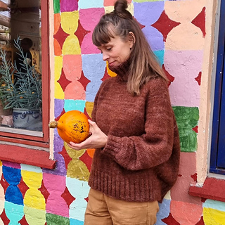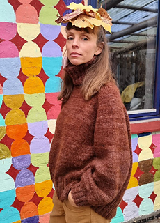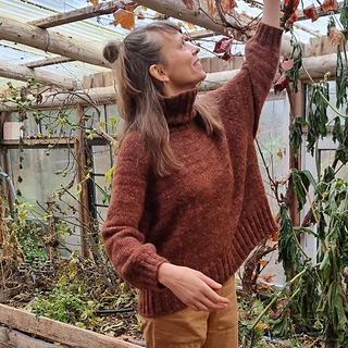 The sweater begins at the neckline, where you first knit back and forth with increases to shape the neck, while also working raglan increases. Once the neckline is shaped, the work is joined and you now knit in the round in stockinette stitch with raglan increases until the bottom of the armhole, where the work is divided into body and sleeves. The body is knitted straight down in stockinette stitch with a few increases on each side for a slight A-shape. Before the rib edge, short rows are worked to create extra length at the back, and finally a wide rib edge is knitted. The sleeves are knitted in stockinette stitch with decreases on the underside. The sleeve is also finished with a wide rib edge. Finally, a high roll neck is knitted at the neckline.