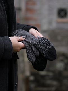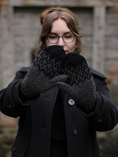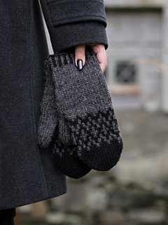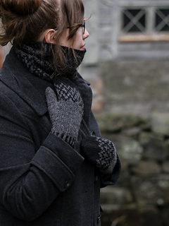 Echo mittens are knit with two colours of aran/bulky weight yarn. The mittens are started with a corrugated rib edge. Colourwork motif on the palm switches the colour for the end of the mitten. The mittens have a gusseted thumb for a great fit. The instructions are written for magic loop, but can be worked with dpns as well. This pattern is the perfect pair for Shadow collar.