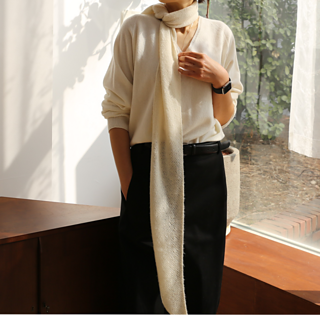 Écru Scarf는 부드럽게 브러싱된 캐시미어로 완성하는 가벼운 사선 스카프입니다.
