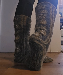 Super cute, super warm knitted slipper boots! These are knit top down in two colors of aran wool of your choice…. third color accents are added via Swiss Darning. Repeated floral pattern for shaft of bootie, separate color pattern for the soles. Size and height are customizable. This pattern is for average adult.