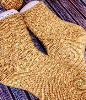 Senfeier looks especially beautiful in shades of mustard, but the pattern works just as well in any solid-colored yarn. Whether bold, subtle, light, or dark, the clean structure of the stitch pattern shows beautifully in plain yarns, making these socks easy to combine with many styles.