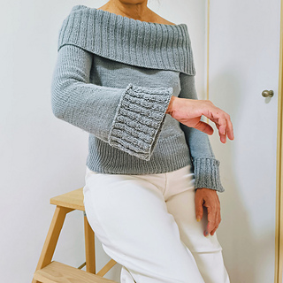 Say hello to the Elan Sweater—an off-shoulder design that’s equal parts simple and sophisticated, making it a timeless addition to your wardrobe. With its fold-over collar and flared sleeves, it might sound tricky to make, but don’t worry—it’s beginner-friendly and uses only basic knitting techniques.
