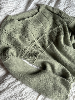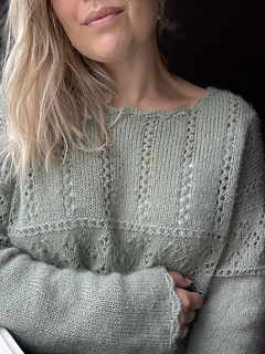 ELDORA_SWEATER is a sweater with many details. It features lace and a crocheted edge that give it a feminine and nostalgic look. You start with the back piece, then pick up stitches for the front pieces. Everything is joined together and knitted in the round before knitting the sleeves. The edges are crocheted on at the end.