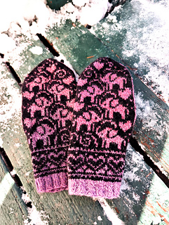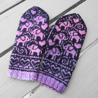 Classic stranded mittens with elephants that can me worked in straight or negative colors. Mittens pattern is fully written and charted. The PDF also has a lot of extra charts with elephants for coordinating (not the same as mittens) hats, sweaters, and socks with fully patterned toes (68 and 72 sts wide). You’ll have lots of fun with elephants!