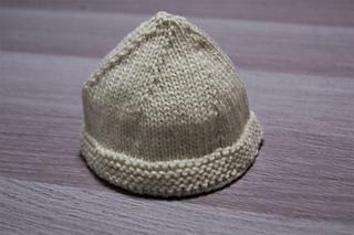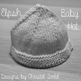 Made to match the elfish slippers, this baby hat pattern has a slight point at the top and a garter stitch brim.