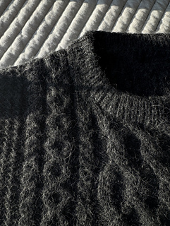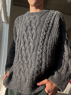 The Elio Sweater is worked from the top down and is designed with a relaxed, oversized fit featuring cable details and textured panels in rice stitch. The Construction allows for the garment to be tried on throughout and lengths to be adjusted as desired. The collar is double-folded. The pattern is graded to standard men’s size charts/measurements.