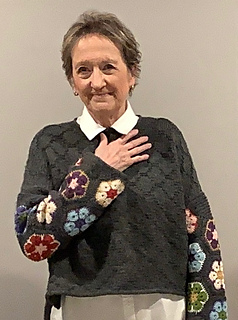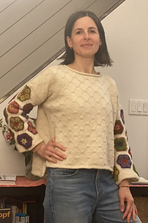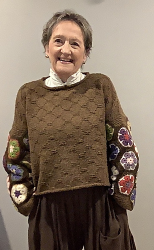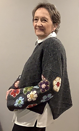 I admired a crocheted sweater like this—multi-coloured, floral sleeves attached to a plain, one colour body. But because I prefer the drape of knitting, I chose to re-create the crocheted sleeves attached to a knit front and back. The stitch pattern used in the knitting is meant to reference the hexagon shape of the crocheted motifs.