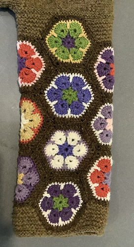 Because crochet is denser, the crochet is worked in fingering yarns. But the knit pieces—including the garter stitch ‘fillers’ to square off the hexagons—are worked in a light worsted. You want to match your knitting yarn to the colour used for the final rounds of the crocheted hexagons: I have found that neutrals (off-white, oatmeal, charcoal gray) make the coordination between yarns easily managed. And as you can see in the dark mustard version, an exact match is not necessary. (In that version the final crochet round is darker.)