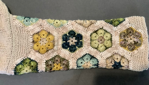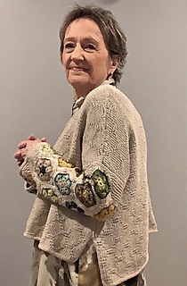 I admired a crocheted sweater like this—multi-coloured, floral sleeves attached to a plain, one colour body. But because I prefer the drape of knitting, I chose to re-create the crocheted sleeves attached to a knit front and back. The stitch pattern used in the knitting is meant to reference the hexagon shape of the crocheted motifs.