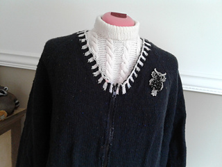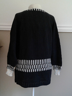 This V-neck long sleeve seamless top-down cardigan has a two-way zipper to be comfortable when sitting if you knit it very long. The fair isle design is simple for first time knitters. The design is on the body, crew neckband and above the cuffs.