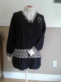 This cardigan has 4” of positive ease. Ex: 35”/89cm will be 39”/99cm when finished. Any DK Weight Yarn can be used. Try using a variegated contrasting yarn for the fair isle design for a different look. V-neck allows a beautiful necklace to be shown or wear with a turtleneck sweater for extra warmth as shown in the picture.