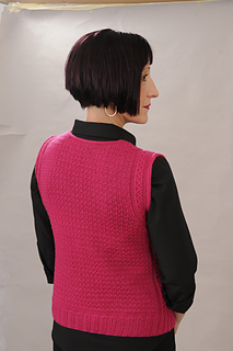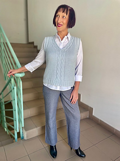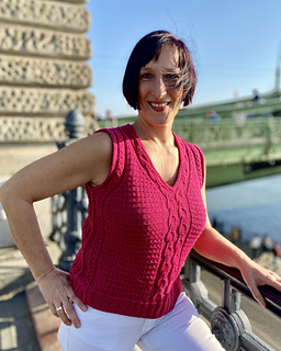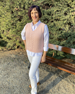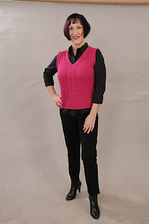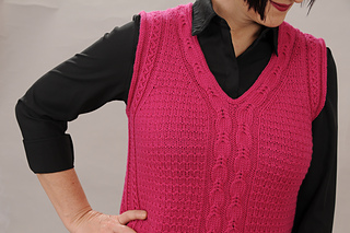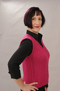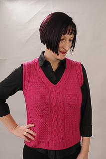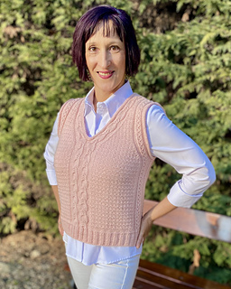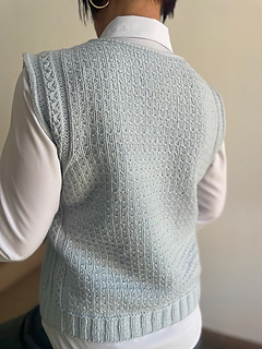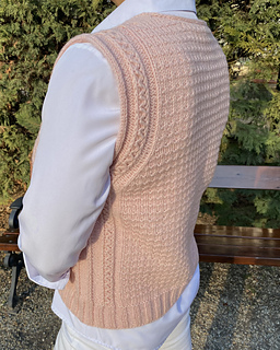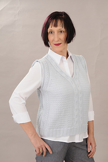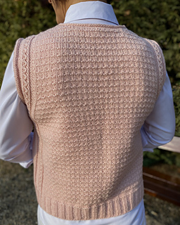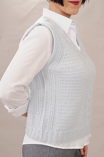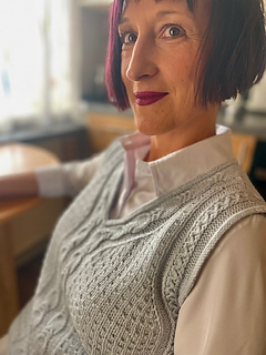The spaces between the cables are worked in a subtle purl ridge textured pattern, adding depth without overwhelming the design. Below the armholes, a faux side seam marks the transition between the front and back, giving the slipover a tailored finish. The body is completed with a classic 2x2 rib hem, while the V-neckline and armholes are finished with a neat, applied I-cord.