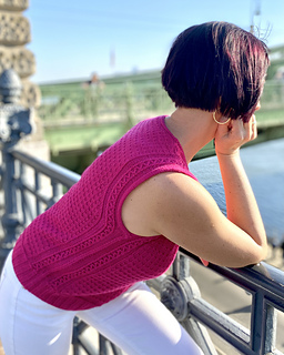 The slipover is worked seamlessly from the top down. The majority of the pattern is worked using charts, with a small number of sections explained through written instructions only.