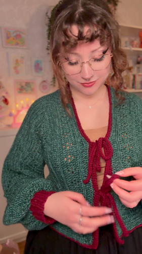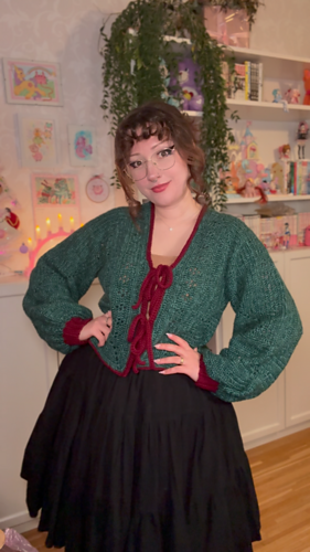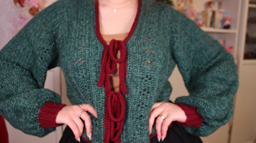 Elsa Blouse is a take on the classic Hexagon Cardigan, with puffy sleeves, a dainty lace & texture pattern, and cute little bows as the closure in the front.