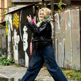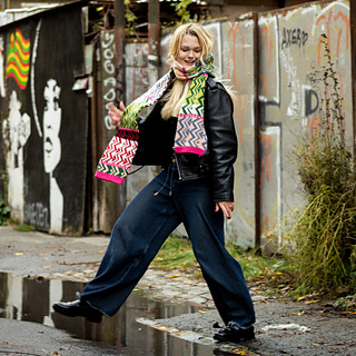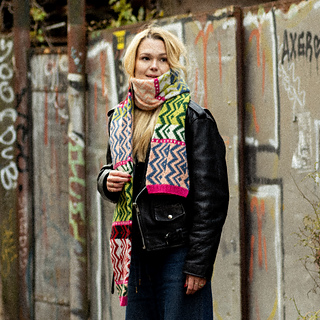 Elver is a big, bold, colorful tube-scarf with colorwork worked in the round following a chart.