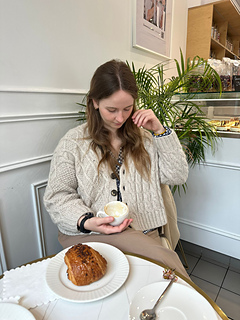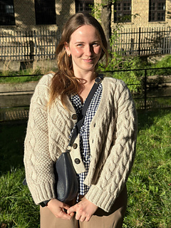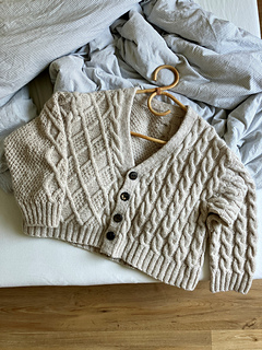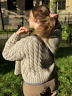 The cardigan is designed to have quite a significant amount of positive ease of 20 - 35 cm. Sizes 1 (2) 3 (4) 5 (6) are recommended for bust circumferences 75 – 85 (85 – 95) 95 – 110 (110 – 125) 125 - 140 (140 - 150) cm. For reference, Bella is wearing a size 3 in all pictures.