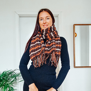 The Ember Plaid Scarf features a unique weaving technique that creates dimensional plaid texture. You’ll crochet the base with simple double crochet stitches, then weave yarn vertically between stitches to form the plaid pattern.