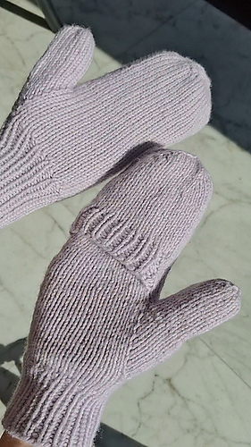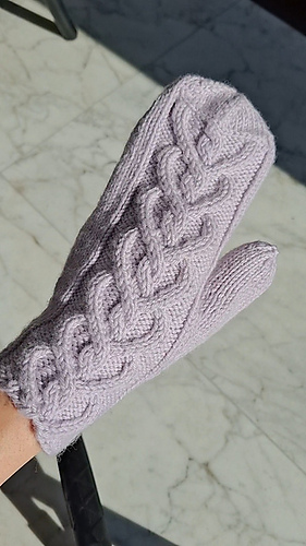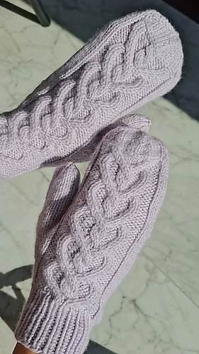 The mittens are worked starting from the cuff, which can be worked in all over ribbing or with the cable motif in the front and the ribbing on the back.