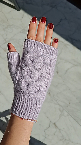 Then you proceed working the cable pattern while increasing for the thumb gusset. When that is completed you place the thumb stitches on hold and finish working the remaining part of the hand. At this point you can decide whether you want a fingerless mitten, a convertible one, or a full mitten. Then you shape the tip of the fingers with decreases and work the thumb.