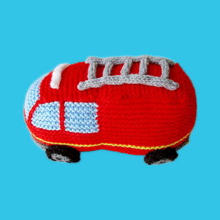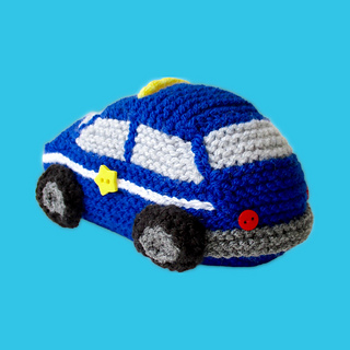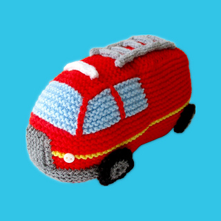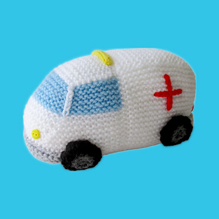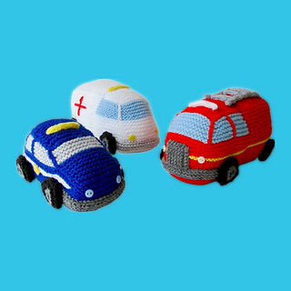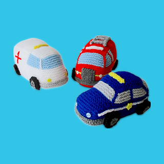 Knit a trio of Emergency Vehicles for playtime fun: a fire engine, ambulance and police car.