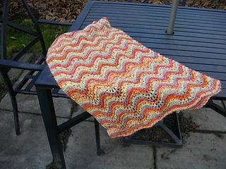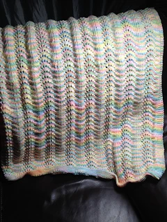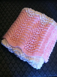 Basic baby blanket made with feather and fan pattern. I used 1.5 skeins of pink and .5 skeins of white. You can add addition multiples of 18 stitches to enlarge and add extra row repeats of 4 rows to lengthen. The size made was for little baby to carry around as security blanket.