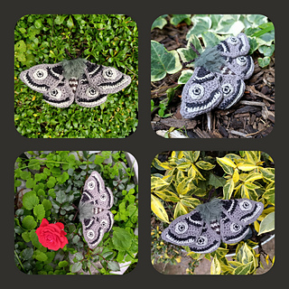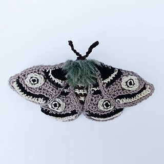 Using superfine yarn and a 2.5mm hook, the moth measures 5.5 in / 14 cm from