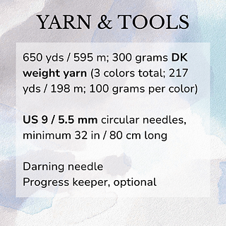 Yarn: 650 yds / 595 m; 300 grams DK weight yarn (3 colors total; 217 yds / 198 m; 100 grams per color)