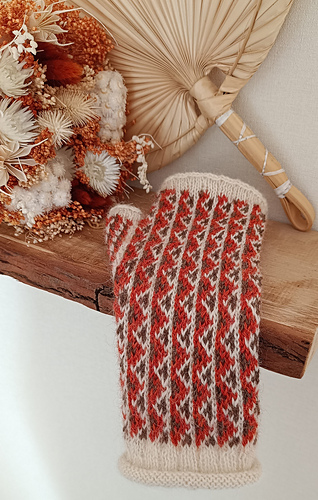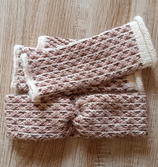 Cet ensemble se tricote en rond avec une laine fine (fingering) dans 3 couleurs harmonieuses. Le motif jacquard, à la fois simple et rythmé, crée un joli jeu de contrastes qui se révèle au fil des tours.