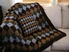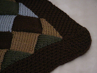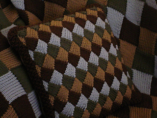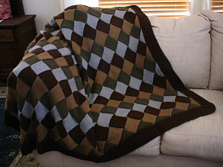 This afghan was designed & knit for a dear friend of mine, and was a true pleasure to create! The pattern includes a very generously sized afghan (approximately 72” x 63”) and two matching pillows (16” square). Only one pillow is shown in the photos. The body is knit in entrelac with the use of 4 colors (each ‘row’ is a single color, to simplify the color changes), with a 3” double seed stitch border all around, and knit in rounded corners. The pillow uses half size squares to mirror the afghan, and includes a 1” border.