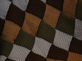 The pattern uses a bulky weight yarn and is knit on American #10.5 needles. I used KnitPics Swish Bulky, but any bulky yarn may be substituted. I used 10 skeins (137 yards) of brown, and 5 each of silver, green, and tan. You will need long circulars (48”) for the afghan, and straight needles for the pillows. A half yard of fabric is needed for the pillow backs, which are constructed as shams for easy care, and two 16” pillow forms. The finishing touches require minimal sewing.