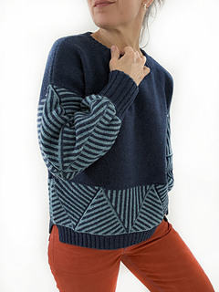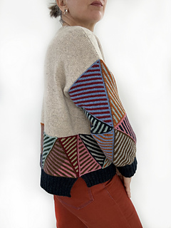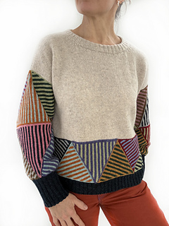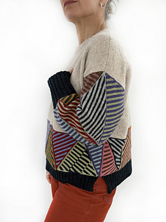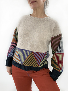 You’ll begin by knitting the modular sleeves. From there, knit the triangle strips for the front and back, then build the sweater upward. The sleeves are attached after seaming the shoulders. Ribbing is added last, and a clean mattress stitch (or linker) brings everything together.