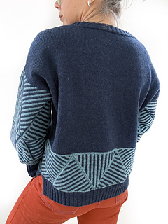 Built from modular triangles, the fabric tessellates into rhythmic, directional movement. Each triangle is knit and joined as you go, forming graphic strips that become the foundation of the sweater.