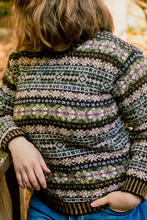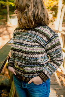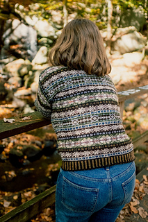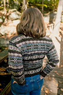 This sweater is a drop shoulder fair isle sweater designed with a classic fit in mind. It is knit starting with the body, bottom-up, and in the round with steeks for the armholes and neck. The shoulders are joined with a 3-needle bind off, and then the steeks are cut open. The sleeves are knit by picking up stitches at the armhole and knitting top down in the round. The collar is then knit by picking up stitches around where the neck steek is cut open.