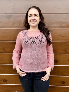 The body and sleeves are worked in stockinette stitch to showcase the softness and halo of the mohair yarn, while the neckline, cuffs, and hem feature a delicate ribbed edge for a clean finish.