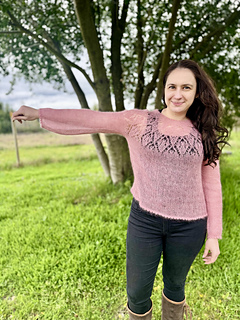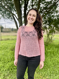 Esencia de Primavera is a light and romantic sweater worked top-down with a single strand of mohair. The highlight of the design is a stunning lace yoke with bold floral motifs, creating an airy, feminine silhouette — perfect for spring or layering throughout the year.
