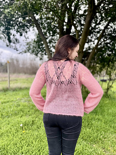 Esencia de Primavera es un sweater ligero, etéreo y romántico, tejido desde el canesú hacia abajo con una sola hebra de mohair. Su principal protagonista es un canesú de encaje floral cuidadosamente diseñado, con calados amplios que crean una silueta femenina, delicada y perfecta para la transición entre estaciones.