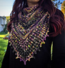 Esmeralda’s Shawlette is a one-skein shawl project that serves wonderfully as a decorative scarf on those brisk fall days. This spooky shawl was inspired by spider silk and features a web-like lace pattern bordered by garter sections and a decorative picot edging. Instructions are provided in both charted and written formats.
