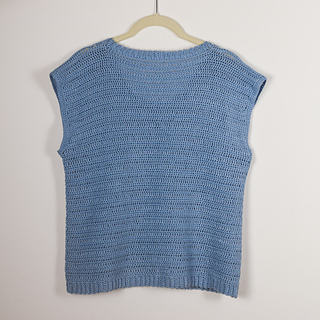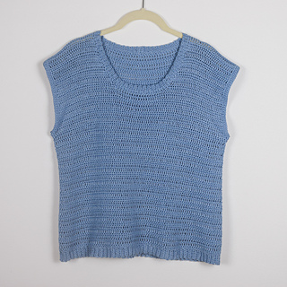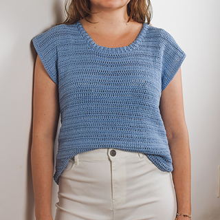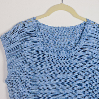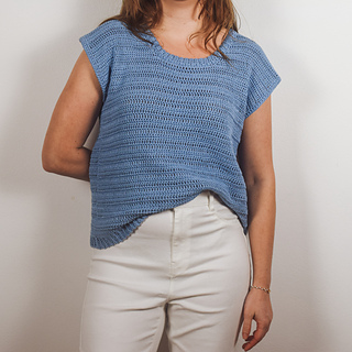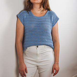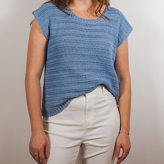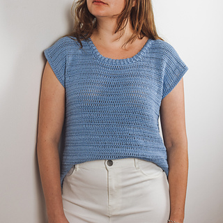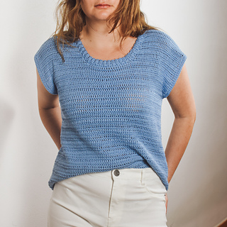 The t-shirt is worked bottom up in two panels: one back panel and one front panel. The finishing of the collar is crocheted onto the body once it’s sewn.