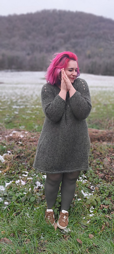 This dress is knitted top down, with a round yoke, long sleeves, increases for the hips and a rolling edge. Made with one strand of alpaca and one of mohair knit together, out of gauge, this dress is very flowy, warm and comfy. Stitches of the neck are picked up to ensure stability and durability of your garnment.