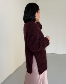 Eun Sweater Mohair is a raglan sweater with a high split worked top down. The folded neckband is worked in double rib stitch, and short rows are worked to shape the neckline. The body is worked in the round in stockinette stitch before being divided into the front and back sections which are worked flat in rib stitch, one at a time.