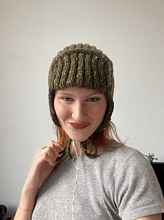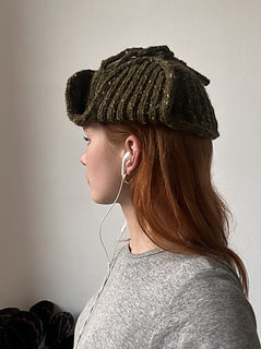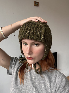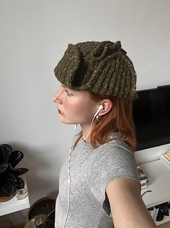 The pattern is knitted in one piece but is not recommended for complete beginners because it involves a lot of simultaneous techniques while knitting. You need to be able to work an I-cord, and I-cord edge, 2 by 2 ribbing and German short rows. The hat is designed to sit rather loosely on the hat, more like a cap than a hat, but can be safely secured by tying it underneath the chin.