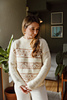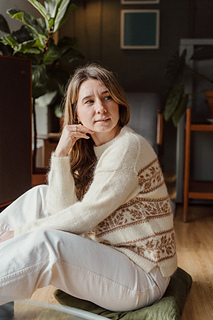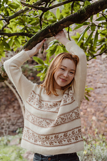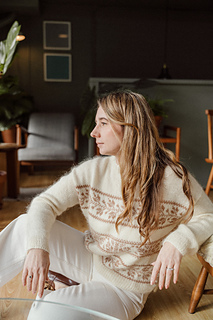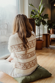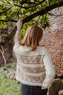 Evergreen (Jumper) is a drop-shoulder sweater, featuring a superb shoulder detail on the upper back, and colourwork motifs on the body. It is worn with an important positive ease for a comfortable look. You have the choice between a double ribbed collar or a funnel neck.