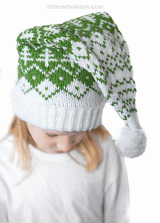 The Evergreen Stocking Cap knitting pattern uses stranded knitting in the round with worsted weight yarn to bring to life this fun wintery Christmas Tree design. This cute Christmas hat pattern starts white at the cozy folded brim, transitions to beautiful green trees and then transitions again back to white all the way to the white snowy pom pom on top. This is a perfect winter knitting pattern!