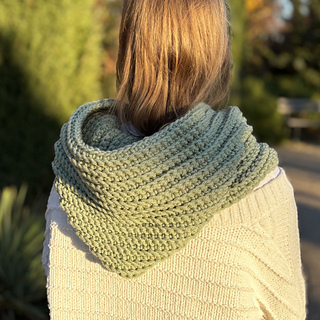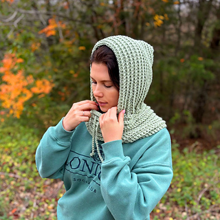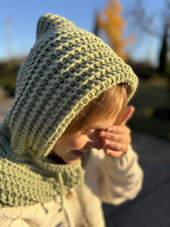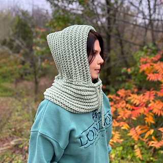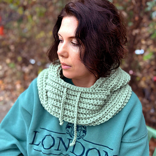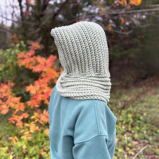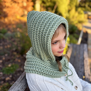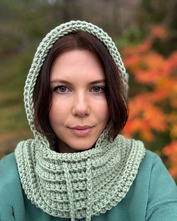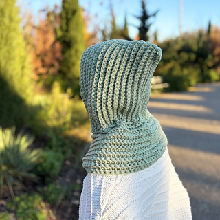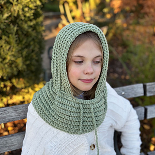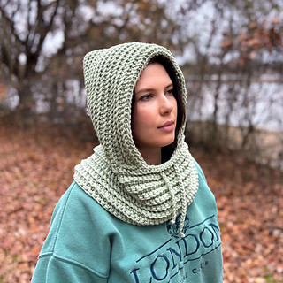 The hood is worked flat, then folded and joined. After that, the cowl is added and worked in turning rounds, creating a comfortable neck warmer that hugs gently without feeling tight. The drawstring lets you cinch the hood on windy days, and the fabric has an easy stretch that fits a wide range of sizes.