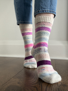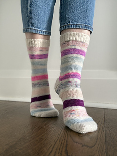 Some things just work - so why mess with tradition? This low-pressure, classic pattern is worked from the cuff down, featuring an optional contrast coloured cuff, heel, and toe. The heel features a classic flap and gusset construction and toe is closed by a Kitchener stitch finish. This is a great fun pair of socks for beginners, stash busters and knit alongs.