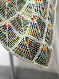 Designed to be both a masterpiece and a “stash-buster,” the construction naturally lends itself to mixing leftovers or highlighting a cherished rainbow colorway. Each section is joined as you work.