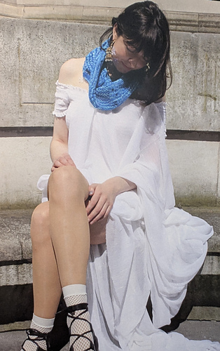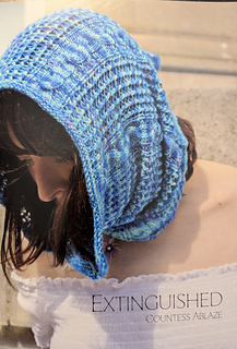 Extinguished is a cowl befitting a Vestal Virgin. Six cables run up the sides to represent the six braids worn in their hair and the lace panels protect their modesty from the male gaze. It also keeps them toasty during those long hours of tending to Vesta’s flame.