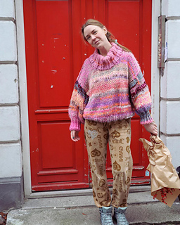 The sweater is designed with an oversize fit and a slightly cropped fit in mind, but can easily be made longer if you prefer. My bust circumference is 96 | 38 inches, and my sweater is knitted in size M.